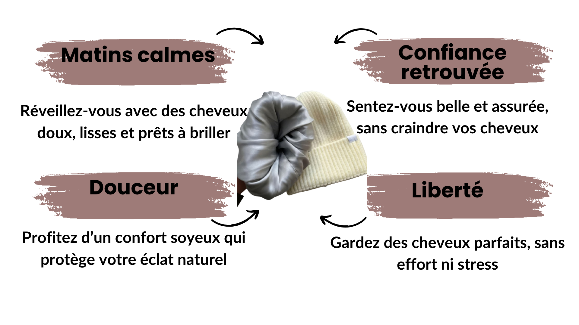 Contrairement aux bonnets traditionnels, il limite les frottements et aide vos cheveux à rester plus lisses, plus doux et moins sujets aux frisottis pendant la journée.